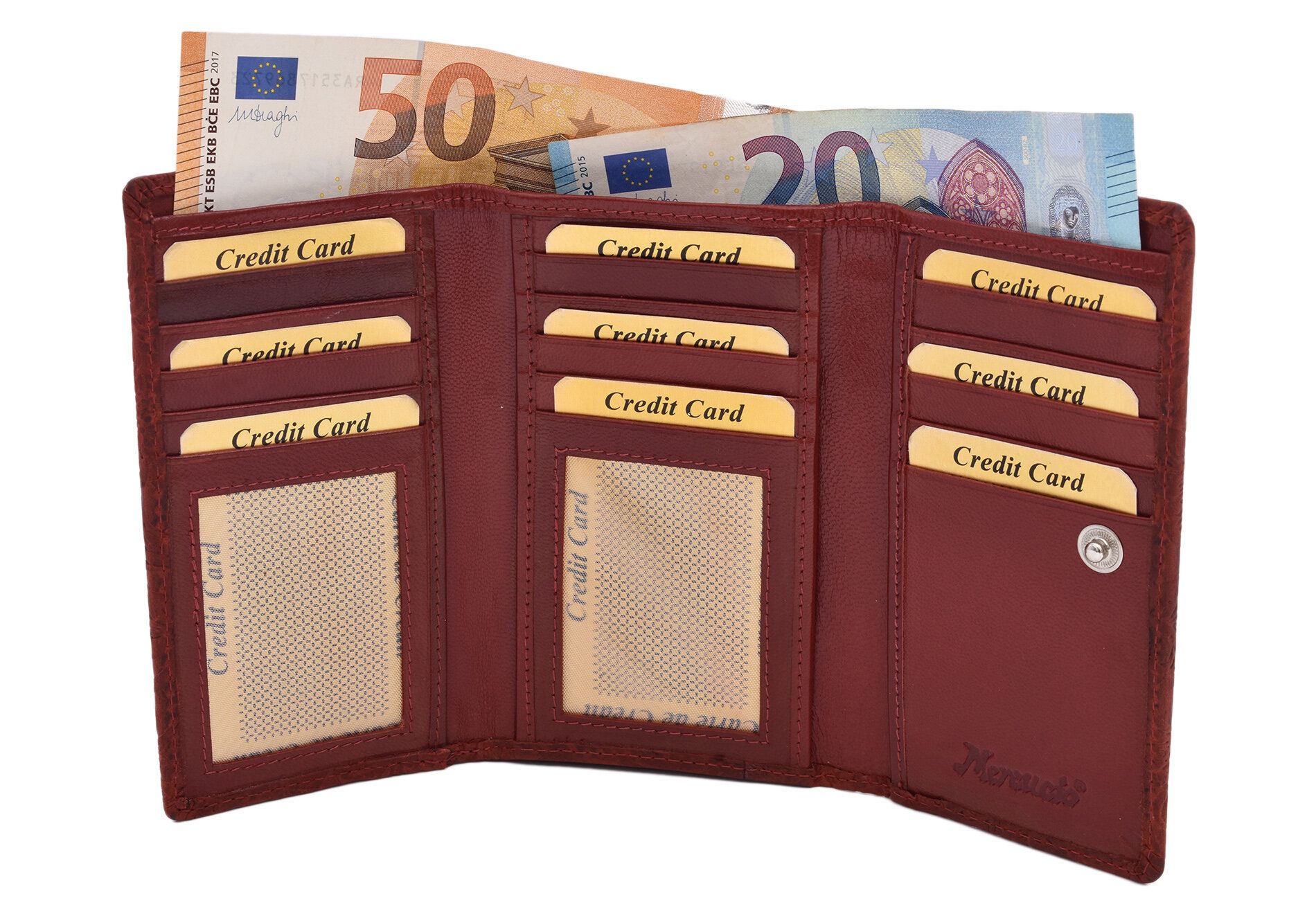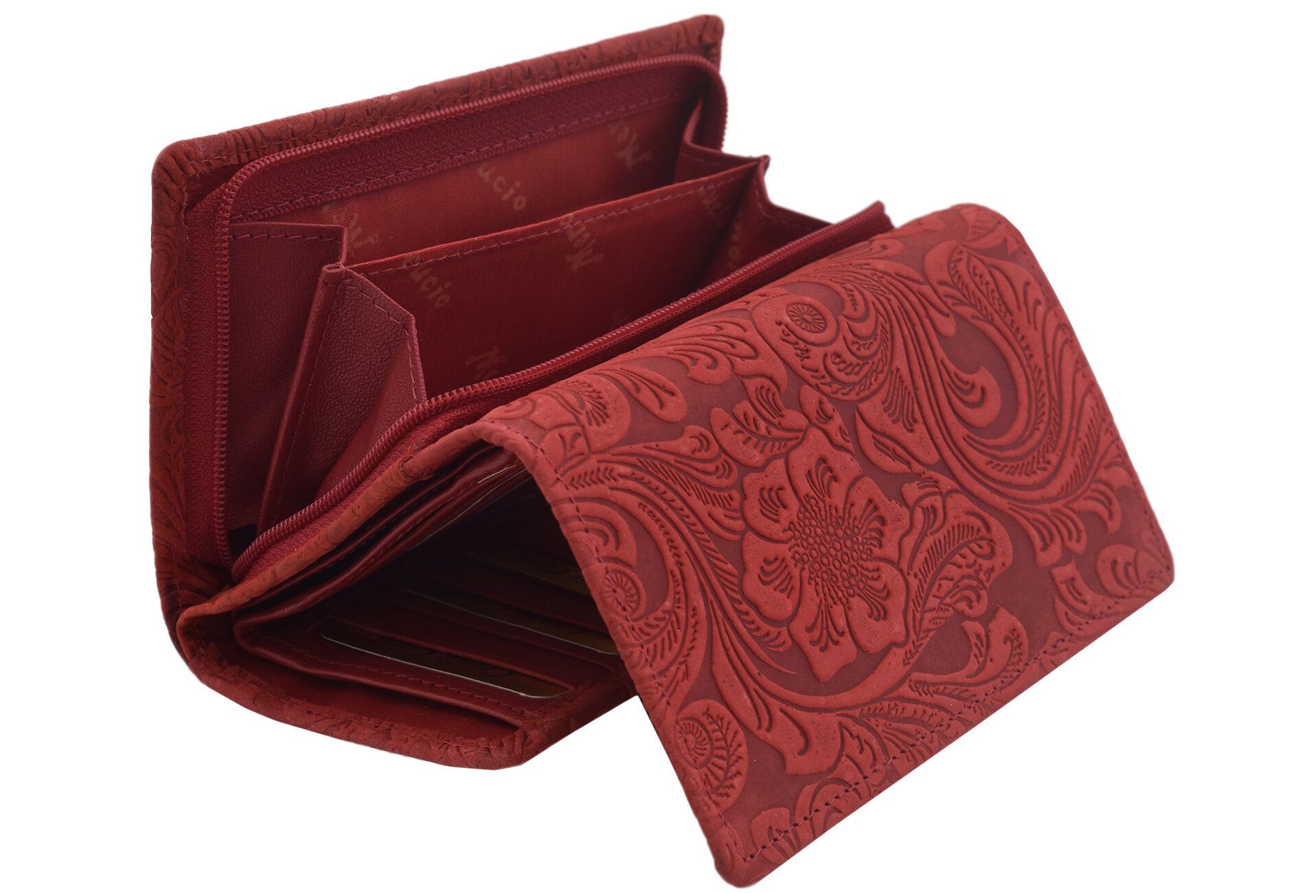 Moderná dámska peňaženka má šmrncovný dizajn v podobe tlačenej hovädzej kože. Vtlačený kvetinový vzor je originálnou súčasťou každej jednej peňaženky, a teda bude unikátom vo vašej zbierke. Tento konkrétny model nájdete v niekoľkých farbených prevedeniach, ako napríklad zelenej, modrej alebo hnedej. Obľúbenou súčasťou peňaženky je priečinok na bankovky, ktorý je rozdelený na dve časti, čo je vzácnosťou u menších kožených peňaženiek.